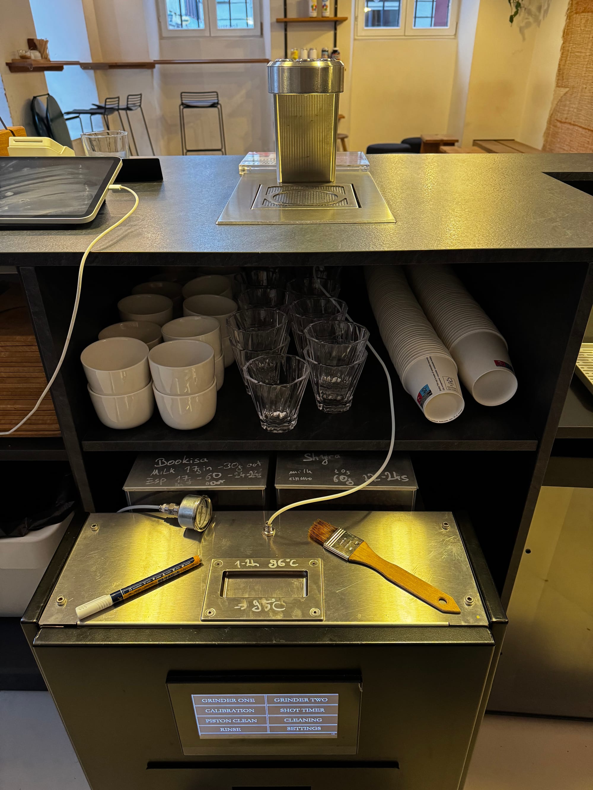 What makes it different isn't only the construction. It's how it feels to work with it. The workflow doesn't resemble anything else — simple, clear, but unfamiliar at first. Once the parameters are set, the machine holds them without needing constant attention. At the same time, it opens up very fine adjustments — the kind Thomas works with constantly, refining each coffee as the lineup changes. I dial in new lots myself now, often within the flow of a regular shift. After a few attempts, it becomes intuitive. Almost too intuitive, like a system that already understands what you're trying to do.